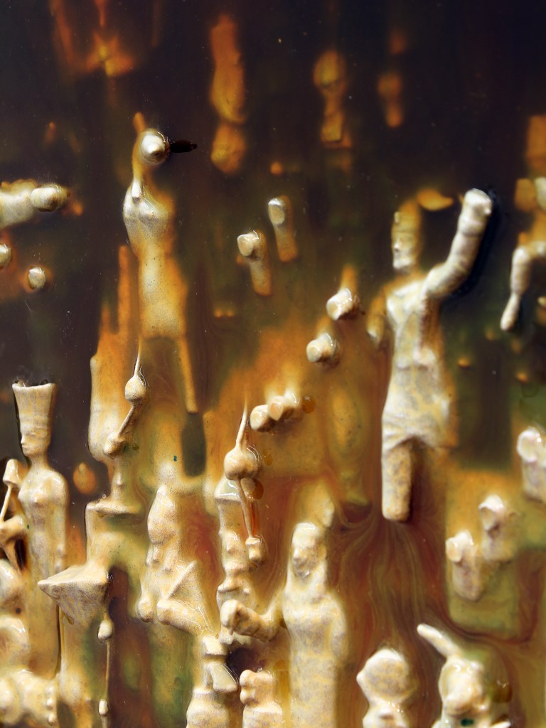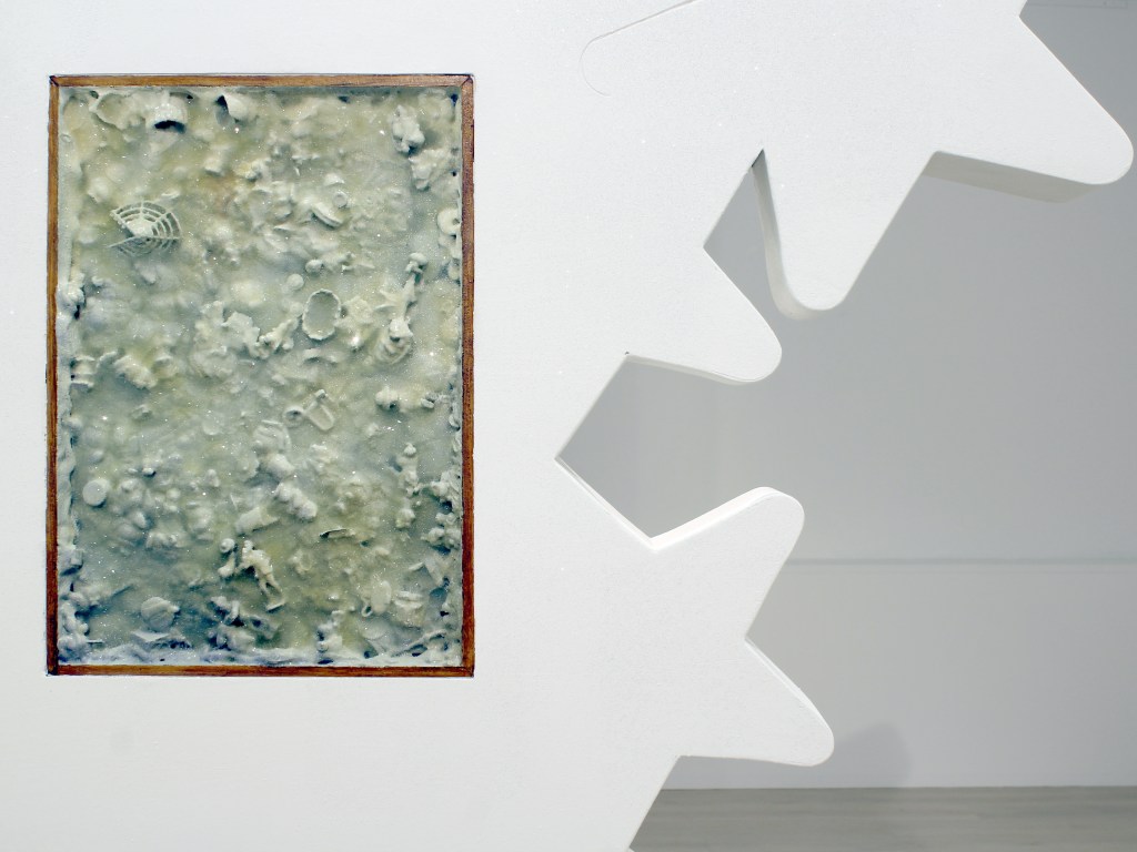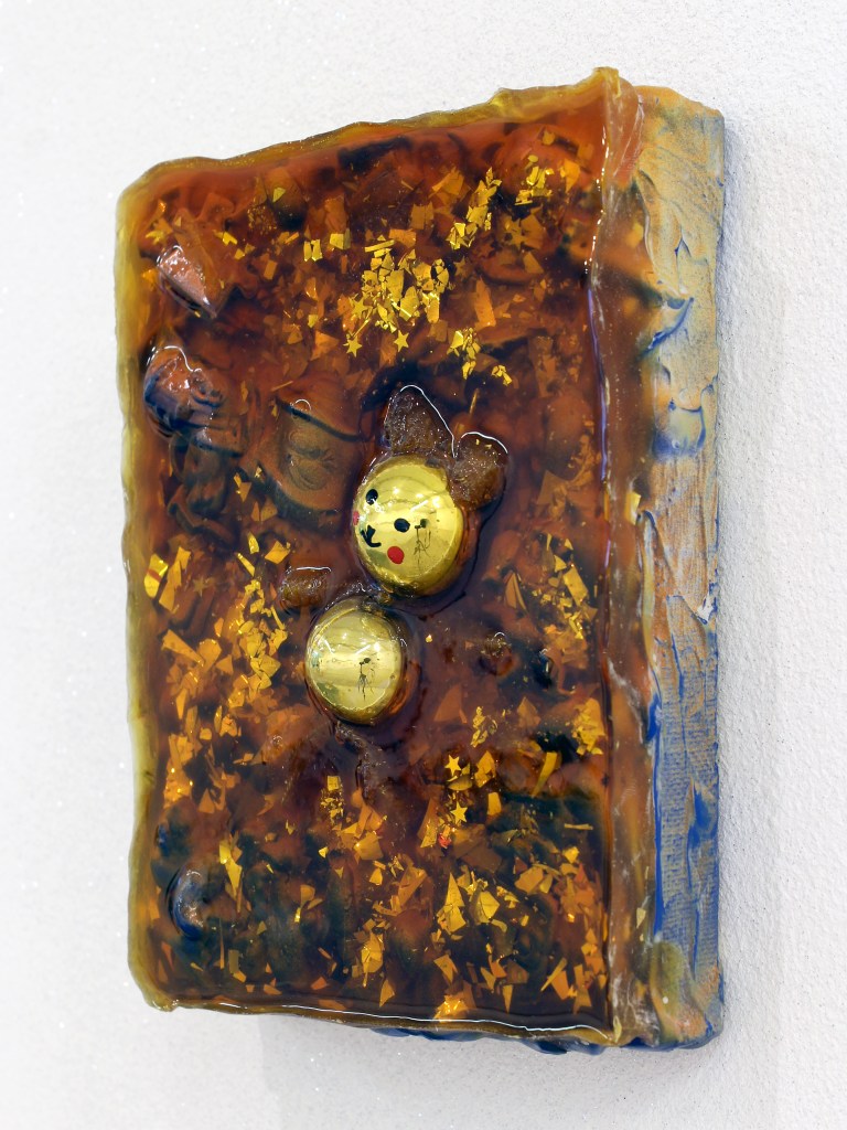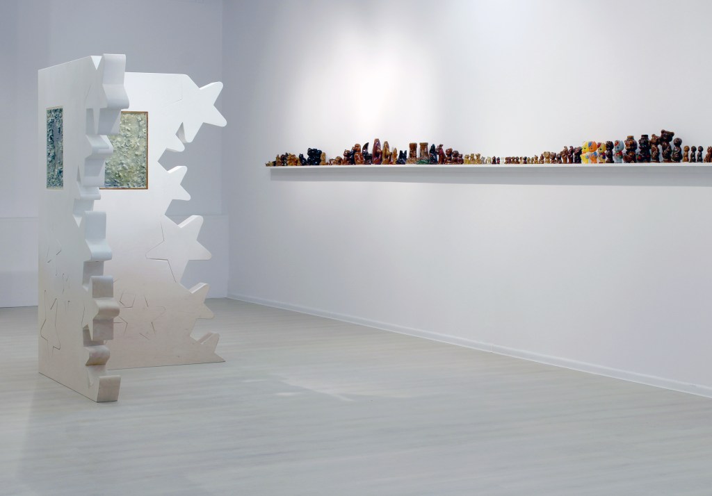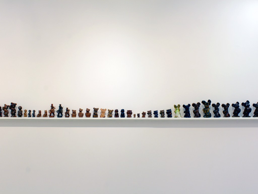 Poprzez polakierowanie figurek i obrazów, a także specyficzny sposób wyeksponowania kojarzą się one z jakimiś znaleziskami archeologicznymi, z czymś pochodzącym z dawnych czasów i zakonserwowanym, aby ocalić ten unikatowy materiał przed zniszczeniem wynikającym z upływu czasu. Ustawione na półce figurki układają się w ciągi typologiczne, możemy więc obserwować wariacje na przykład na temat machającego kotka czy figurki misia. Ten sposób ekspozycji dodatkowo wzmacnia skojarzenie z ekspozycją w muzeum archeologicznym, gdzie często grupuje się eksponaty według ich typologii. Na tych figurkach został niezbyt dokładnie rozprowadzony lakier, co z jednej strony wydaje się je konserwować, ale z drugiej – nadaje im wrażenie śliskości i czegoś niepokojącego. Stają się one reliktem z poprzedniej epoki, z czasu dzieciństwa, który, choć miał miejsce niedawno, wydaje się już bardzo odległy i archaiczny.
